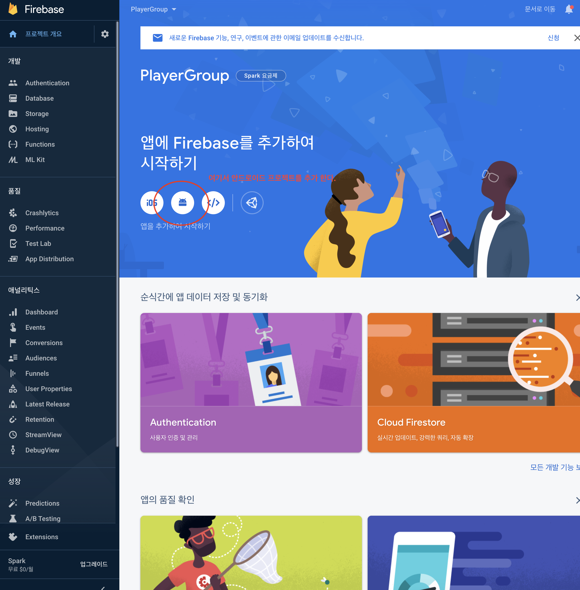 이제 안드로이드 프로젝트 에 파이어베이스를 추가 하는 작업을 진행 한다.