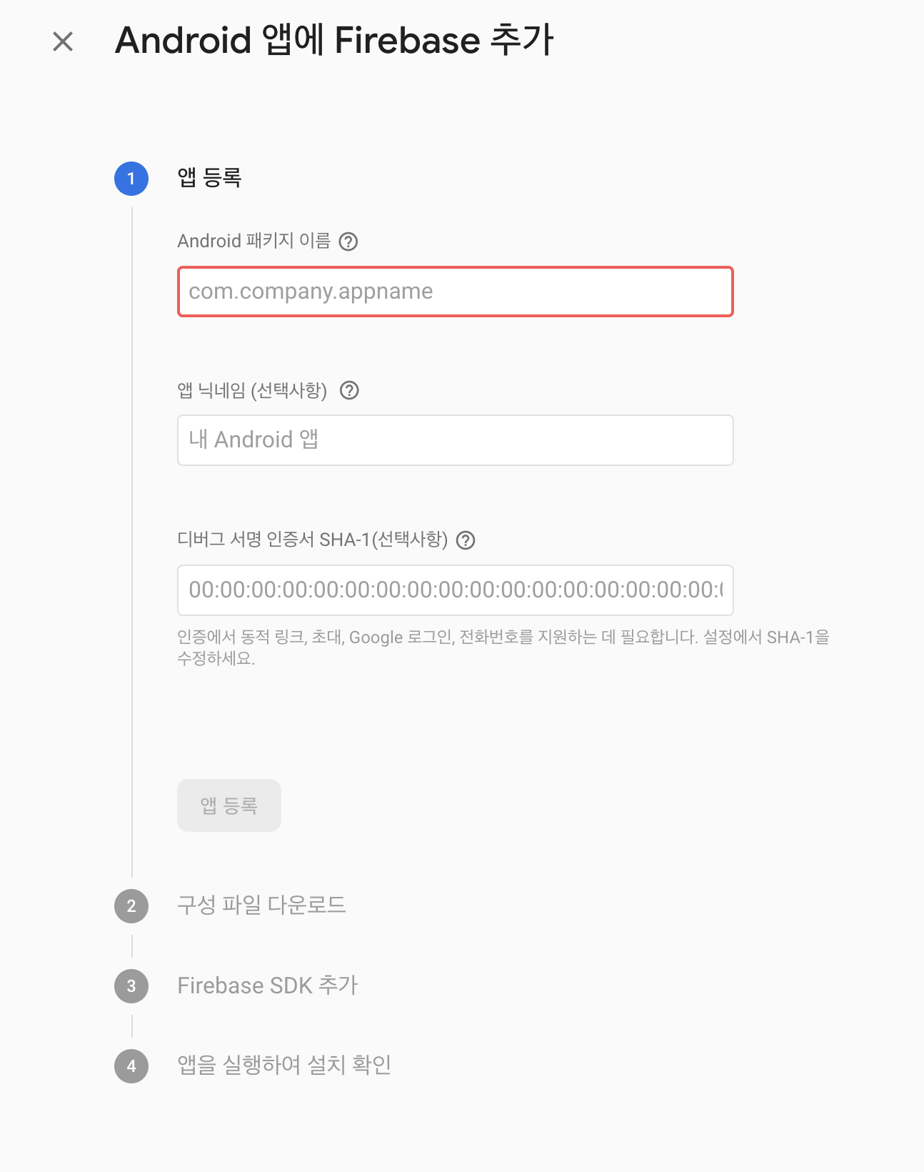 1번 에서는 안드로이드 패키지 이름만 기입하고 패스 해도 된다.