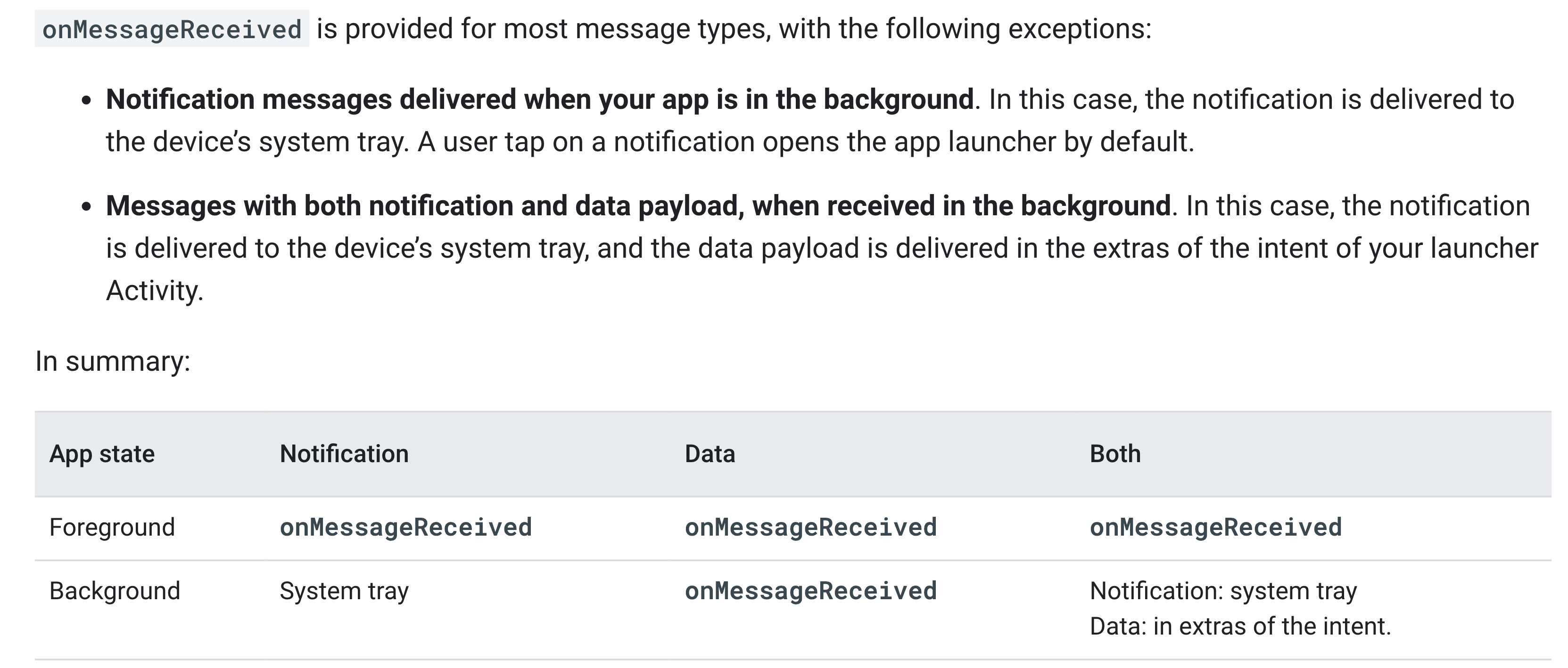 앱이 실행되어 있지 않은 경우에는 데이터에 Notification 키가 있는 경우 SDK 내에서 처리하고 onMessageReceived 로는 이벤트가 오지 않는 다고 한다.