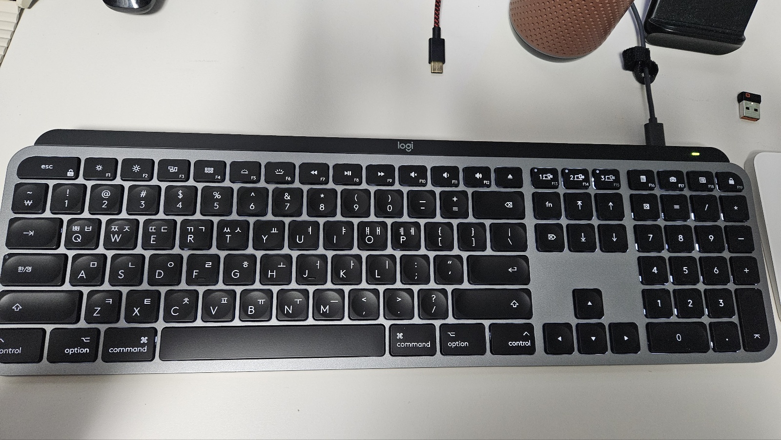 키보드가 충전중일때에트 키보드 오른쪽 LED가 계속 점등이 되고, 완충되면 계속 켜져 있단다