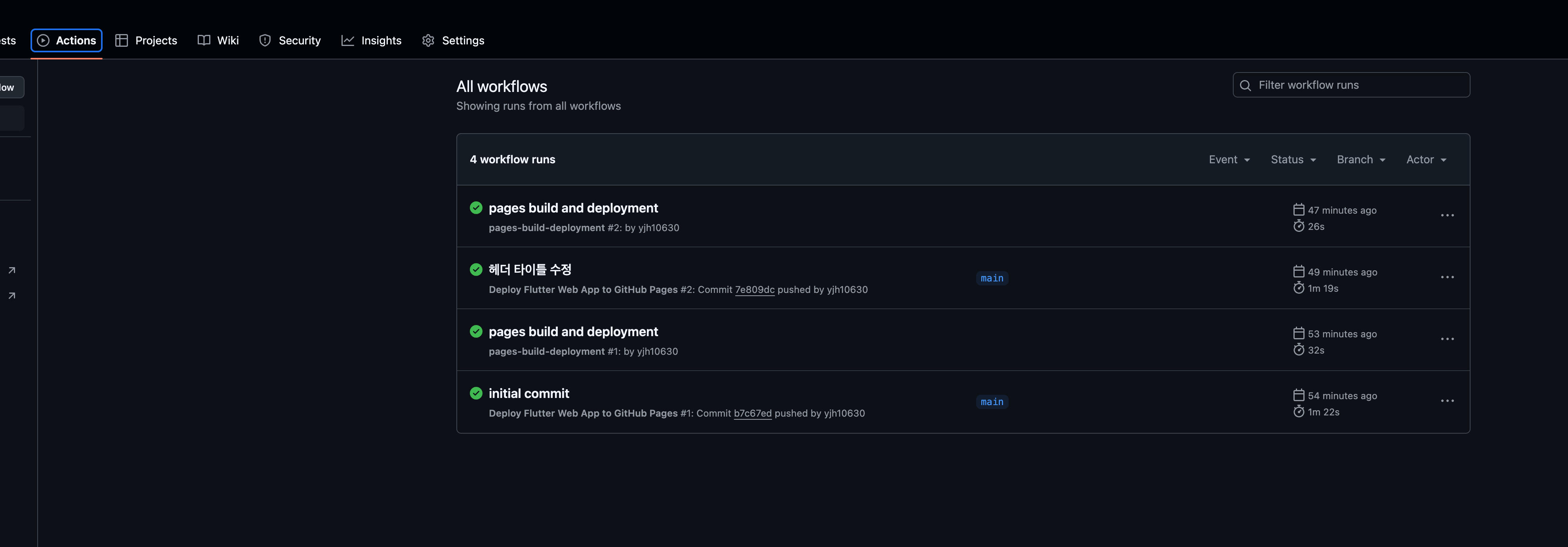 그리고 형상 관리를 통해 내가 Flutter 코드를 수정 해서 Github에 Commit 하게 되면 자동으로 빌드해서 Pages 에 배포 되는 형식인 CI/CD 또한 같이 적용 될 수 있도록 해보려고 한다.